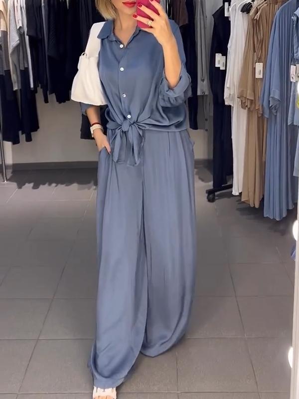 Women's Casual Arm Hollow Tie Top and Skirt Suit