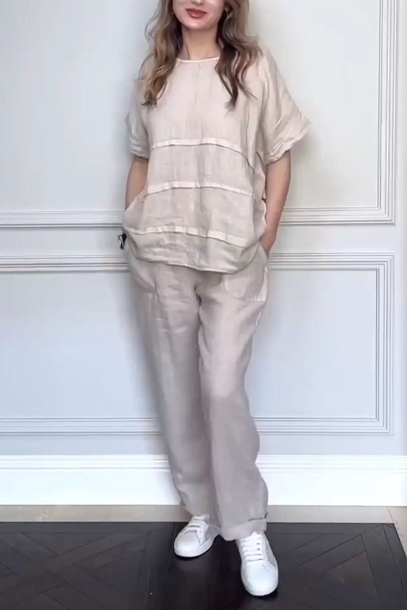 Women's Round Neck Solid Color Cotton and Linen Two Piece Suit