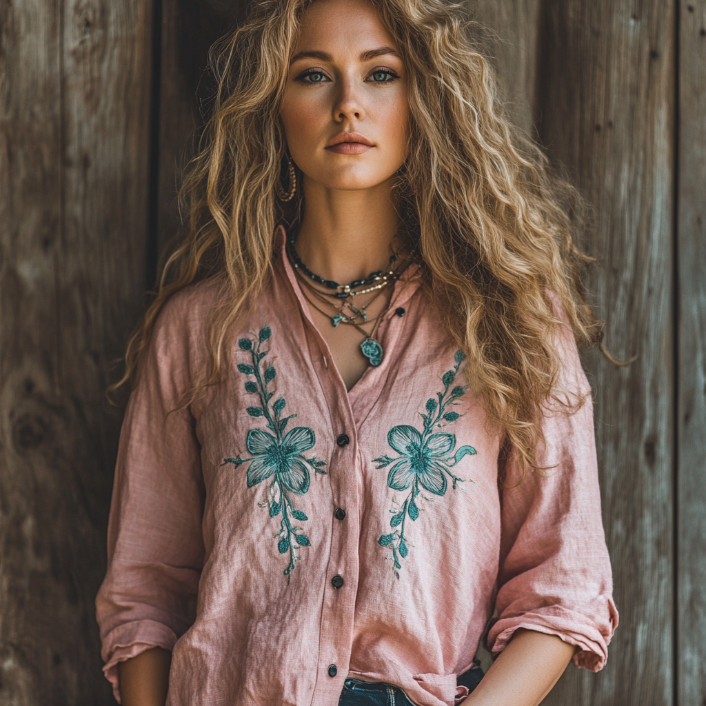 Casual Floral Embroidered Linen Long Sleeve Shirt