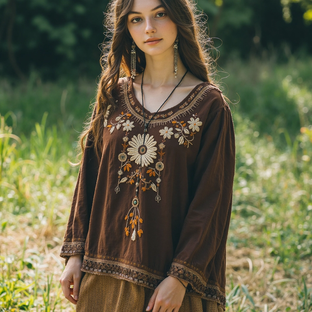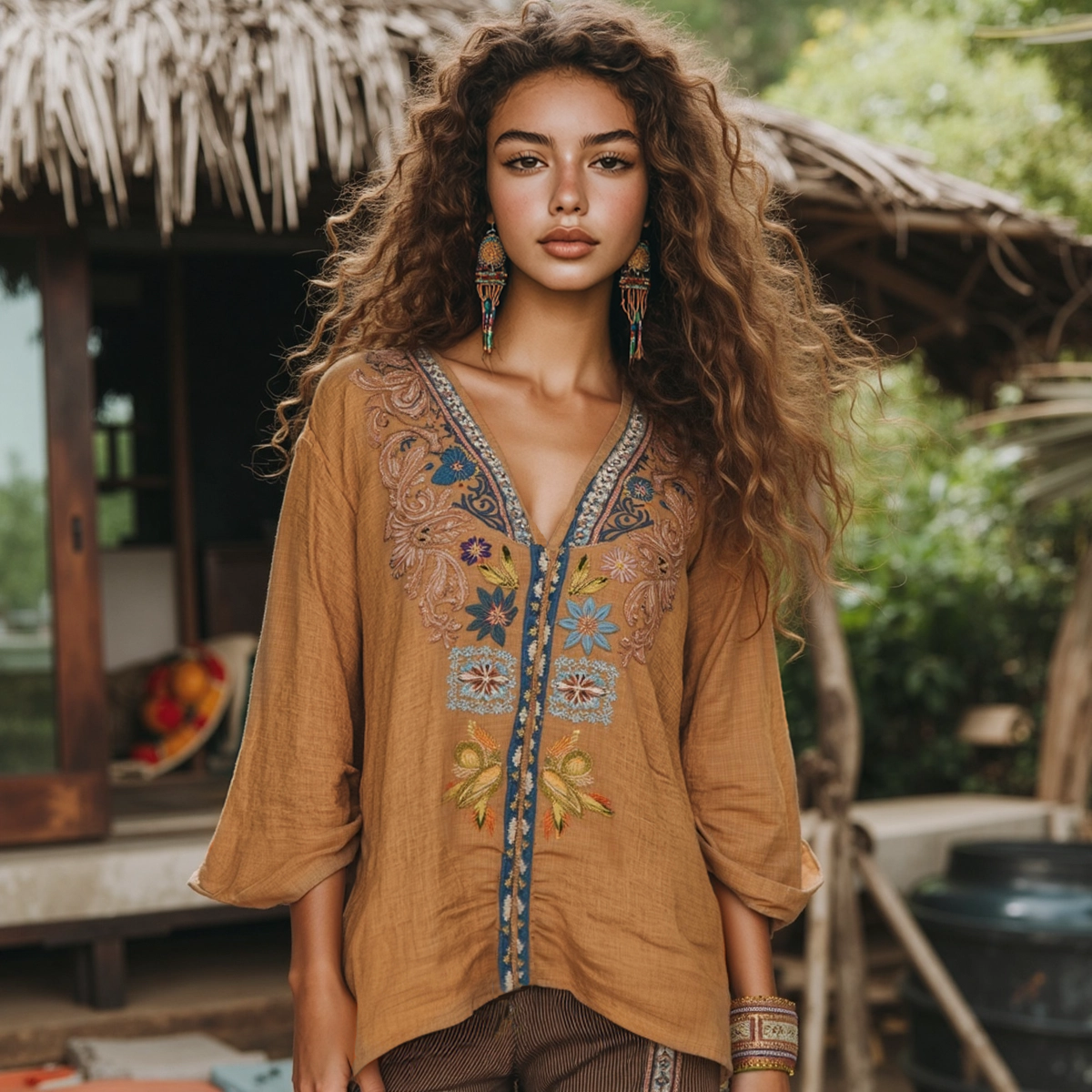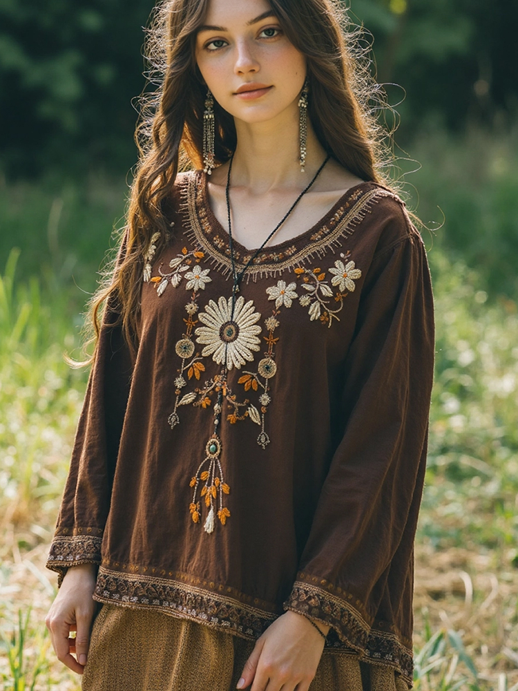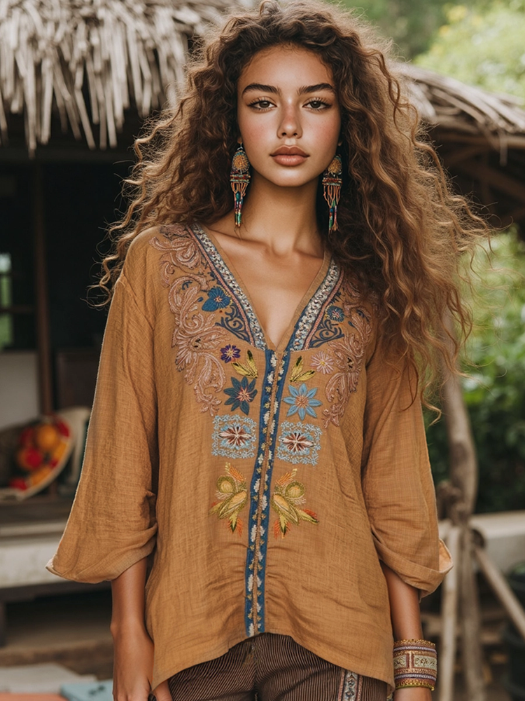 Boho Floral Tribal Embroidery Print Cotton And Linen Blend Loose Blouse