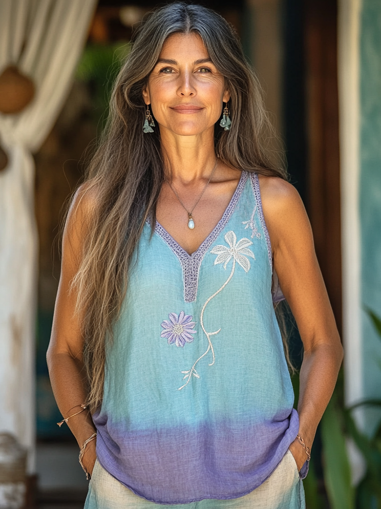 Women's Retro Loose Gradient Bohemia Ethnic Style Linen V-neek Sleeveless Top