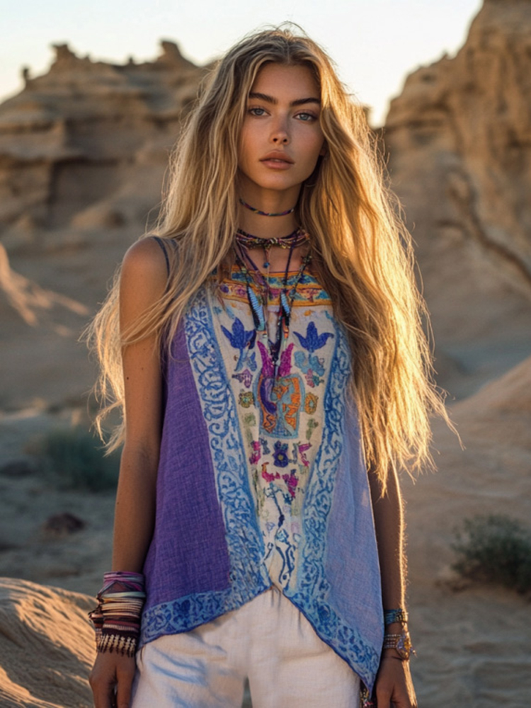 Women's Bohemia Ethnic Patchwork Style Linen Sleeveless Top