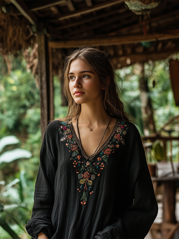 Vintage Tribal Ethnic Style Embroidered Linen V-neck Shirt