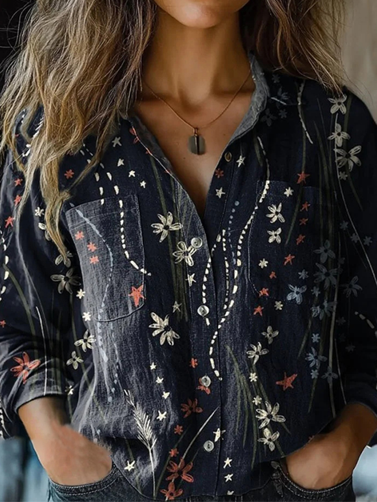 Women's Vintage Floral Art Print Casual Long Sleeve Comfortable Cotton Shirt