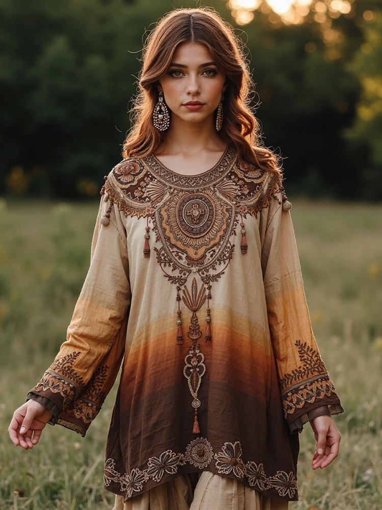 Boho Gradient Tassel Floral Embroidered Linen Round Neck Long Sleeve Blouse