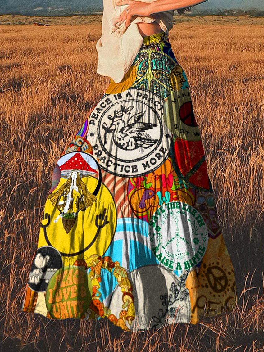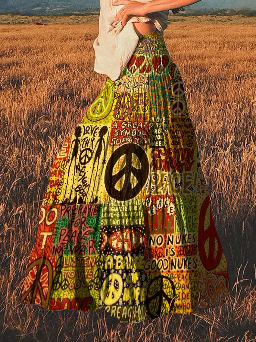 Women's Retro Hippie Peace Print Cotton Pocket Skirt
