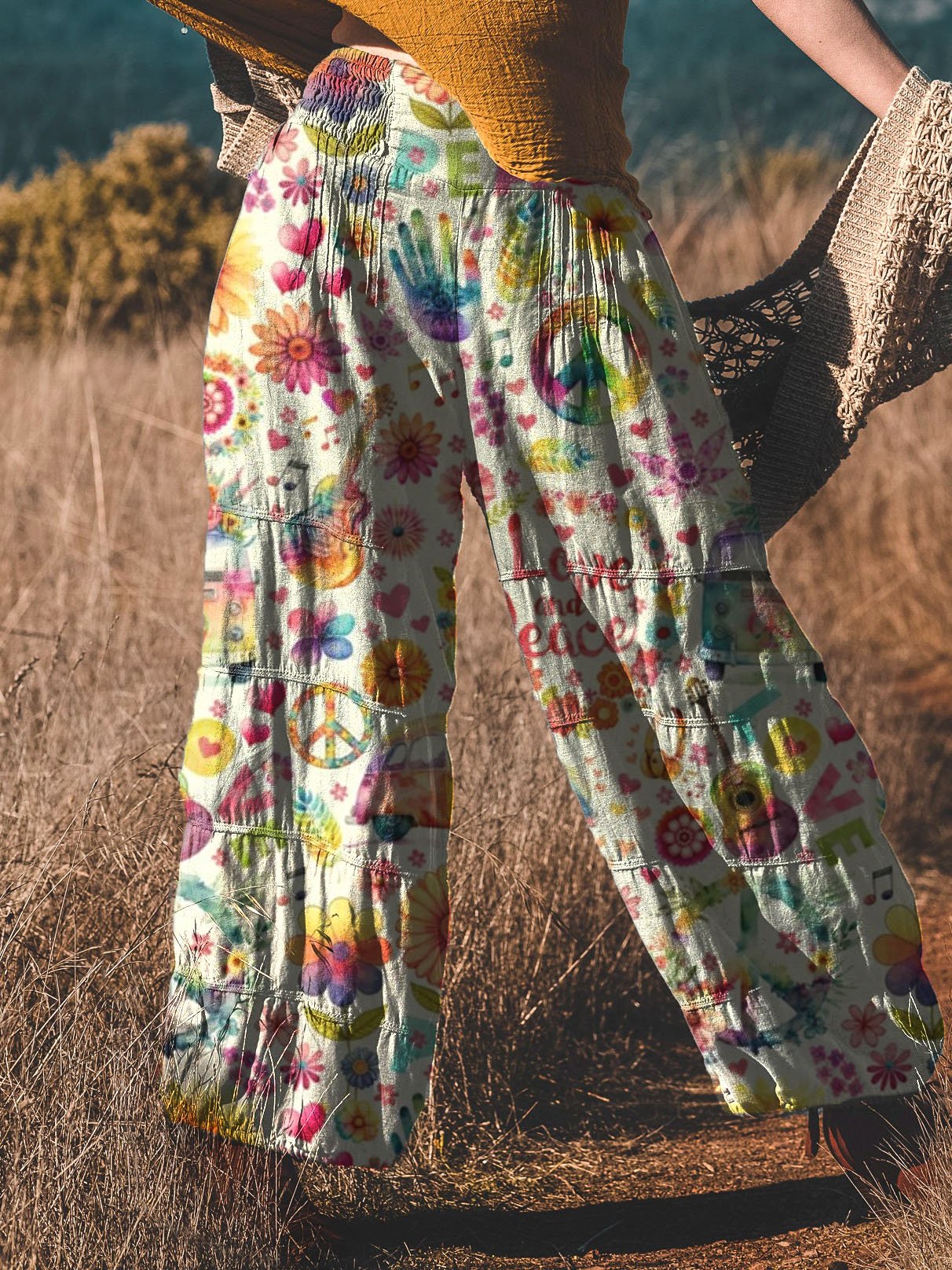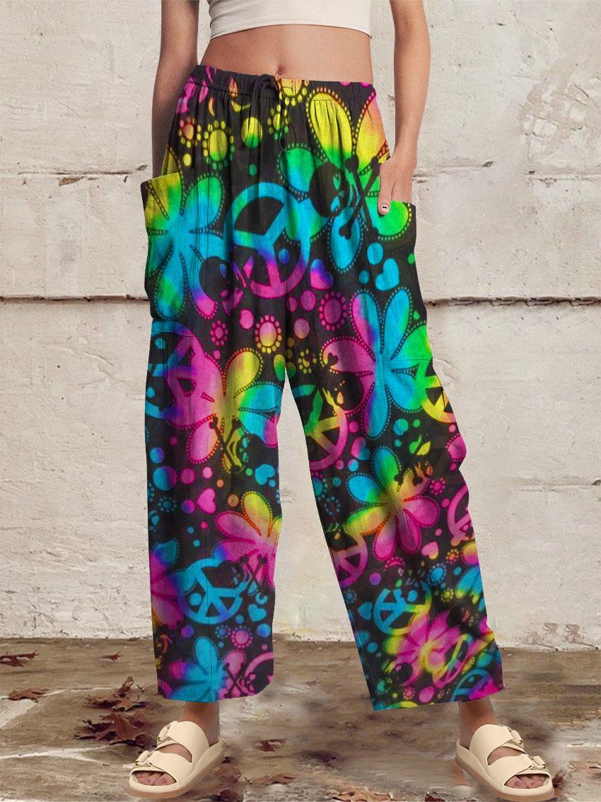 Women's Retro Retro Hippie Watercolor Peace Flower Power Print Pants