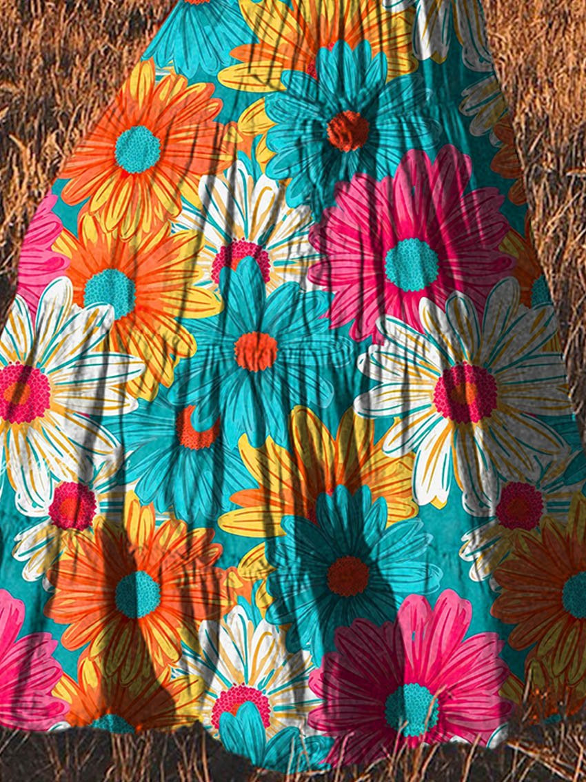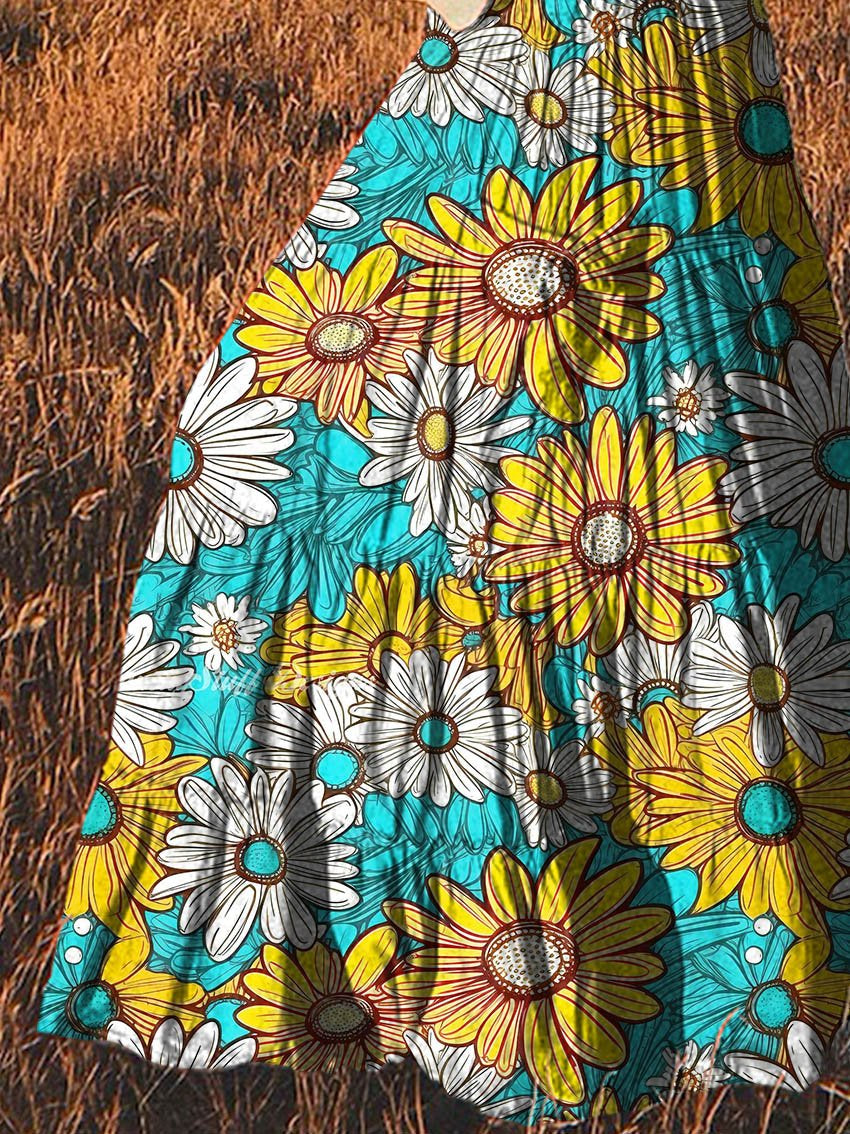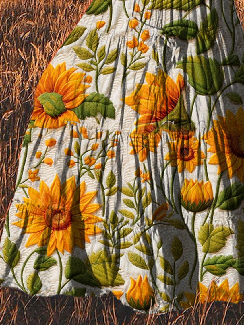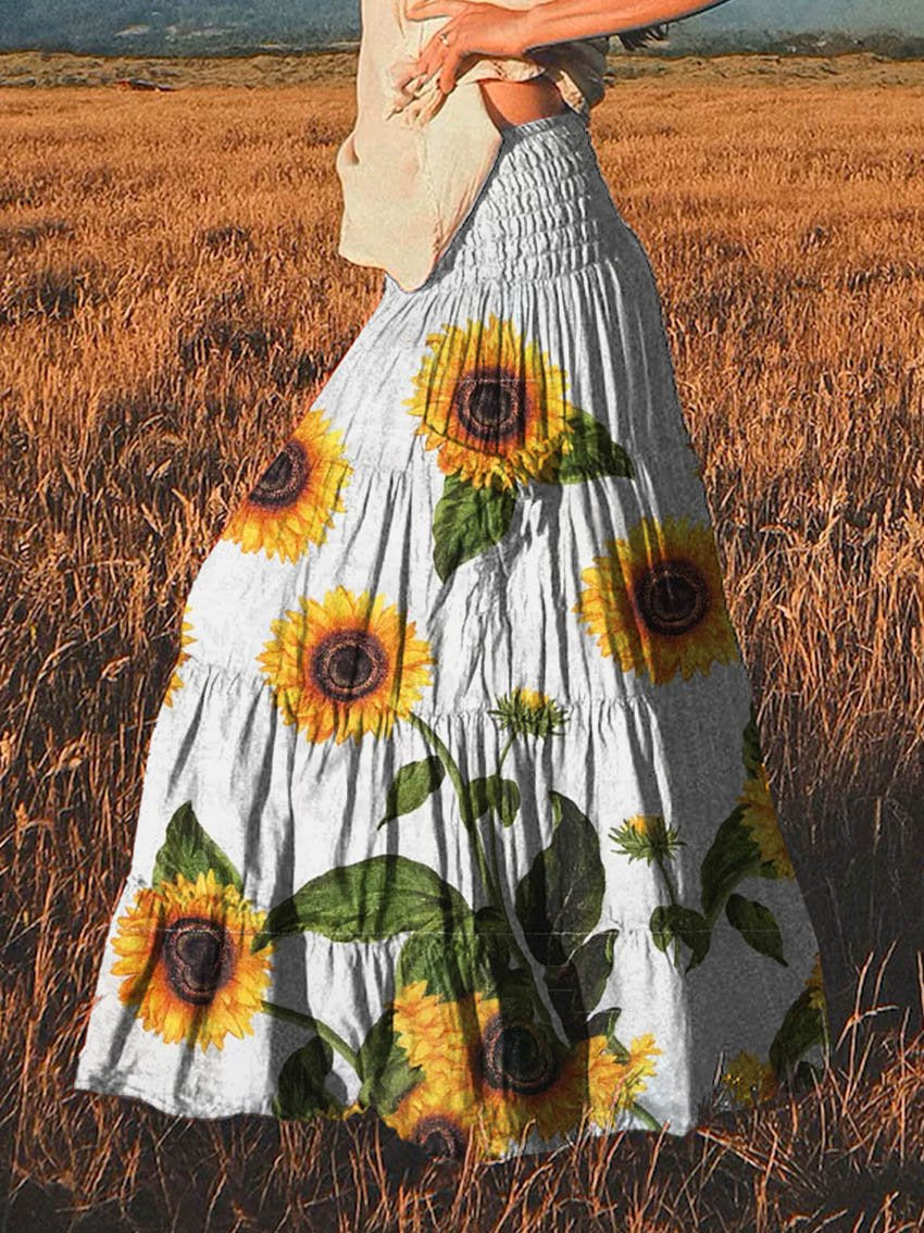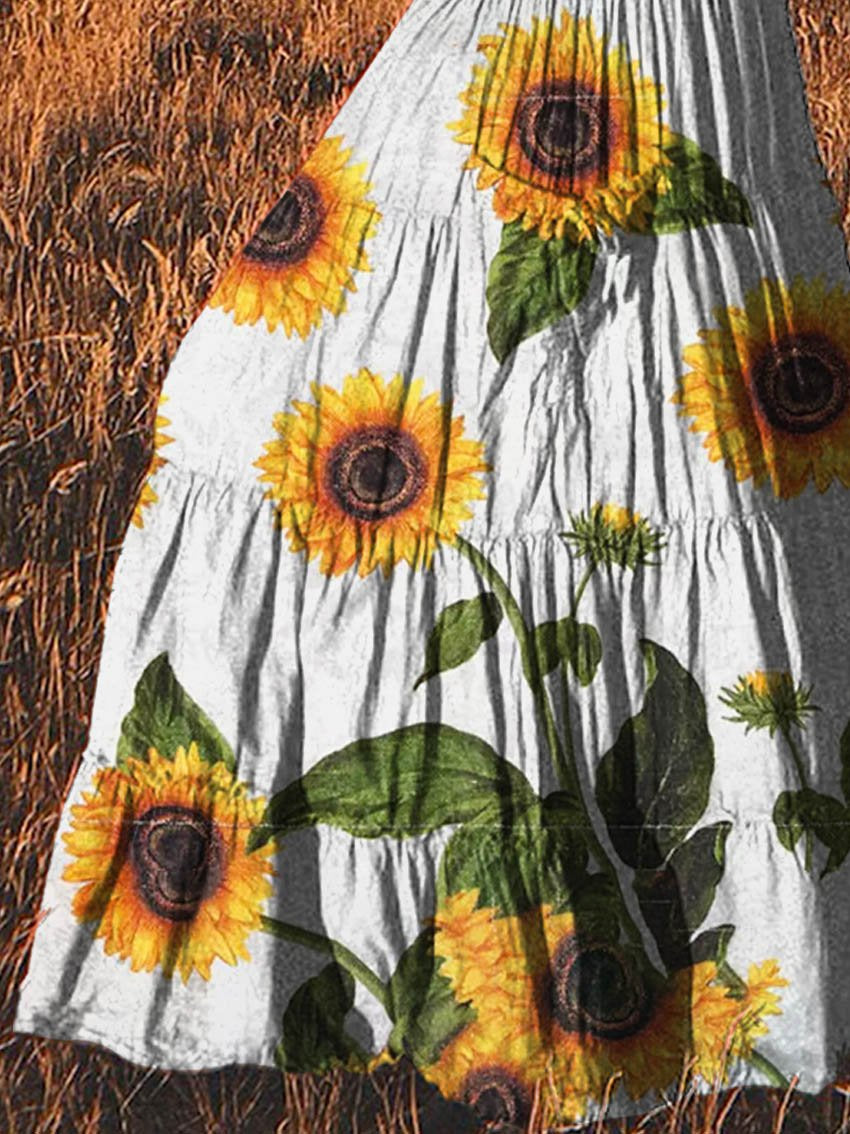 Women's Vintage Sunflower Art Pattern Print Cotton Pocket Skirt