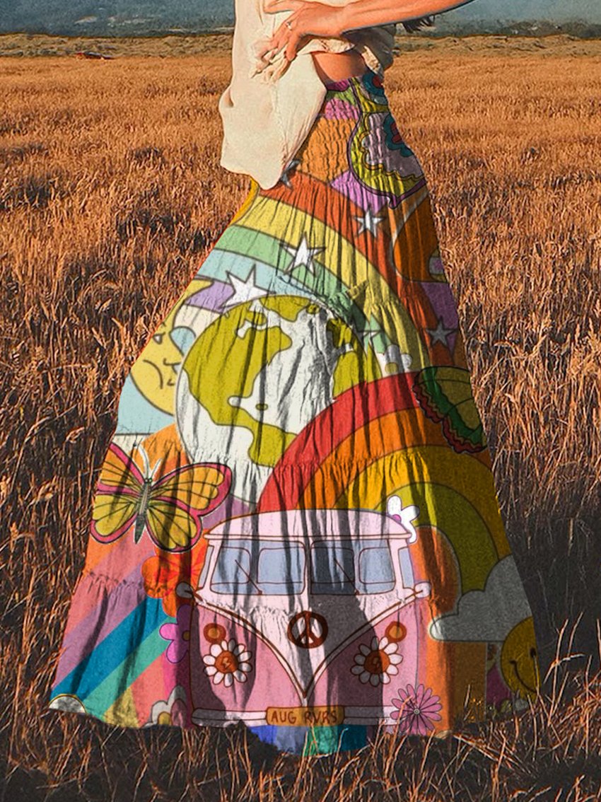 Women's Vintage Hippie Watercolor Peace Flower Power Print Cotton Pocket Skirt