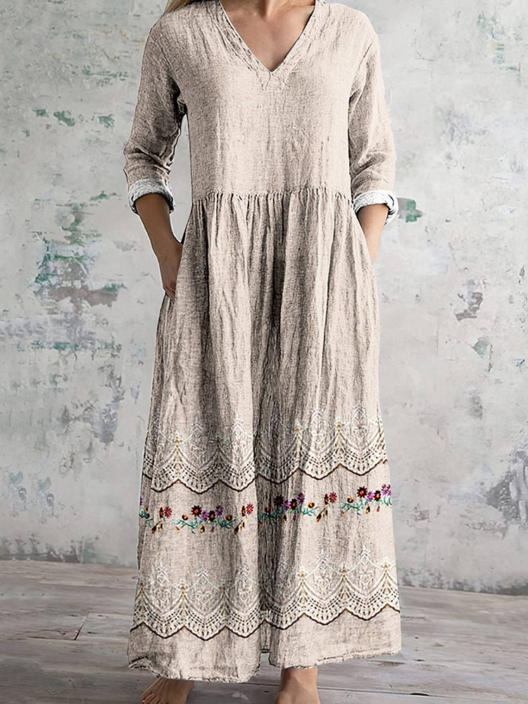 Vintage Floral Embroidery Women's Linen Dress