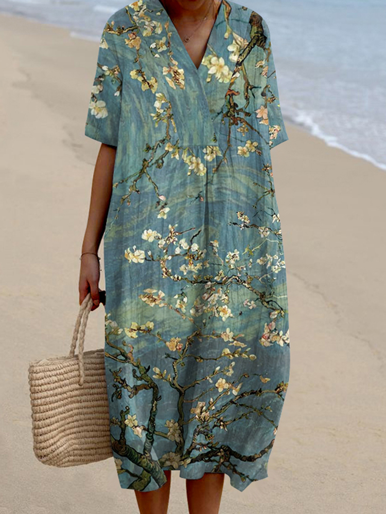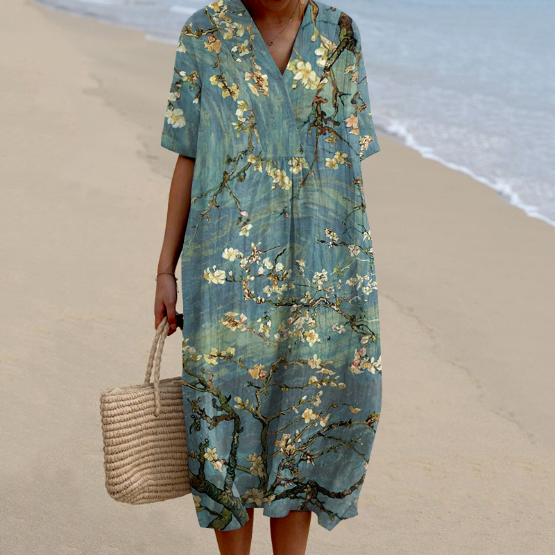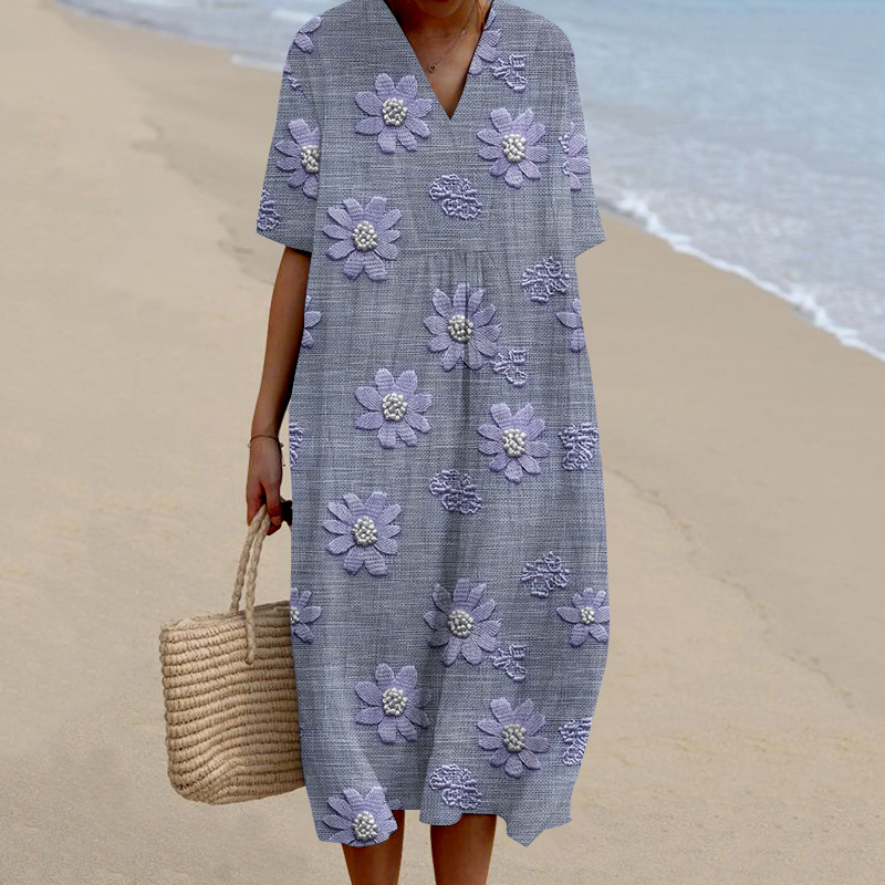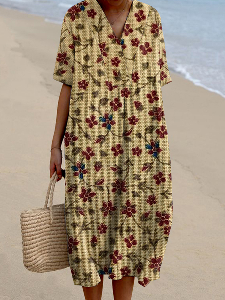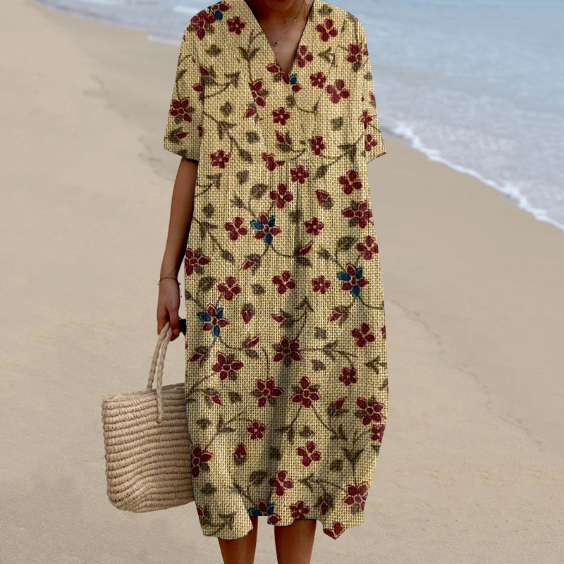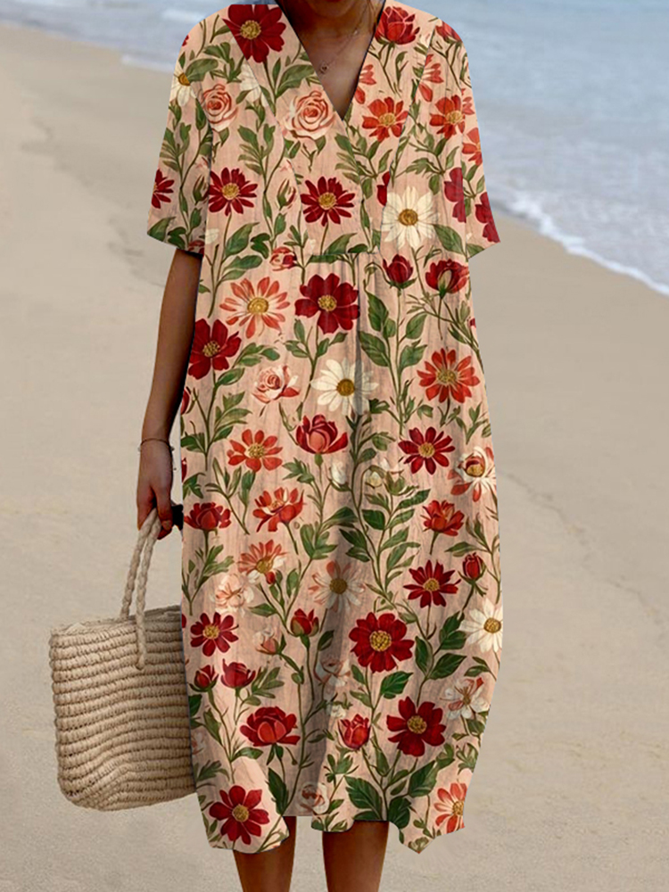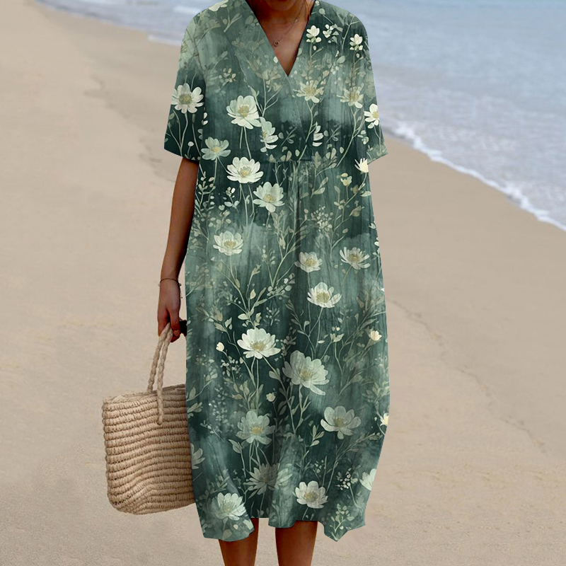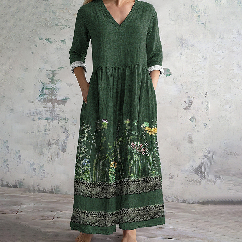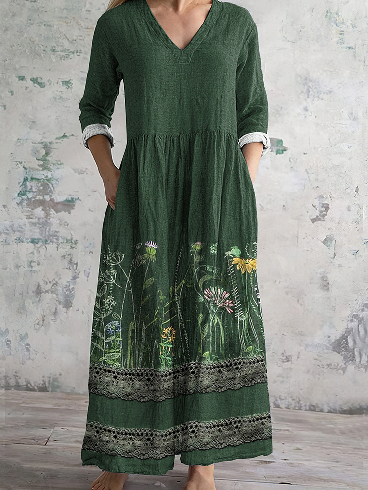 Lace Floral Print V-Neck Loose Midi Dress