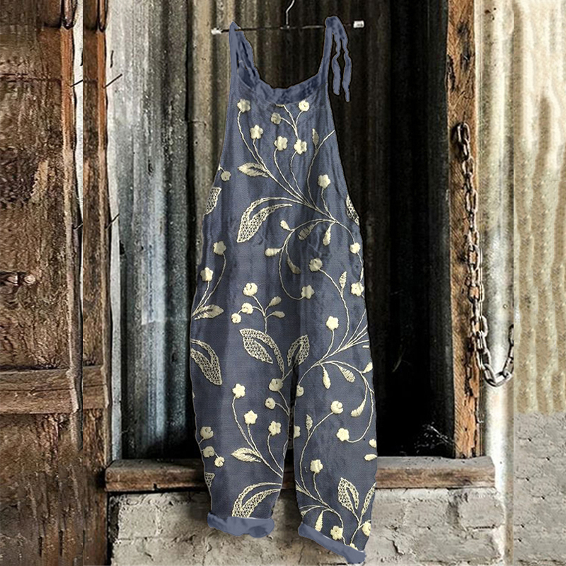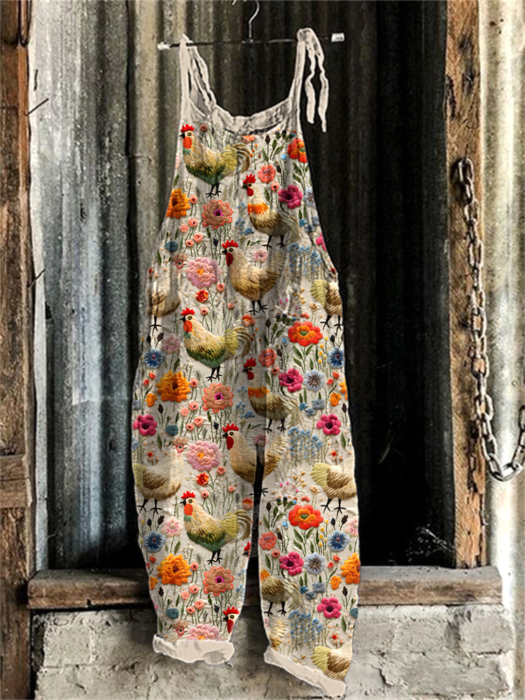 Farm Chicken Floral Embroidery Pattern Linen Casual Jumpsuit