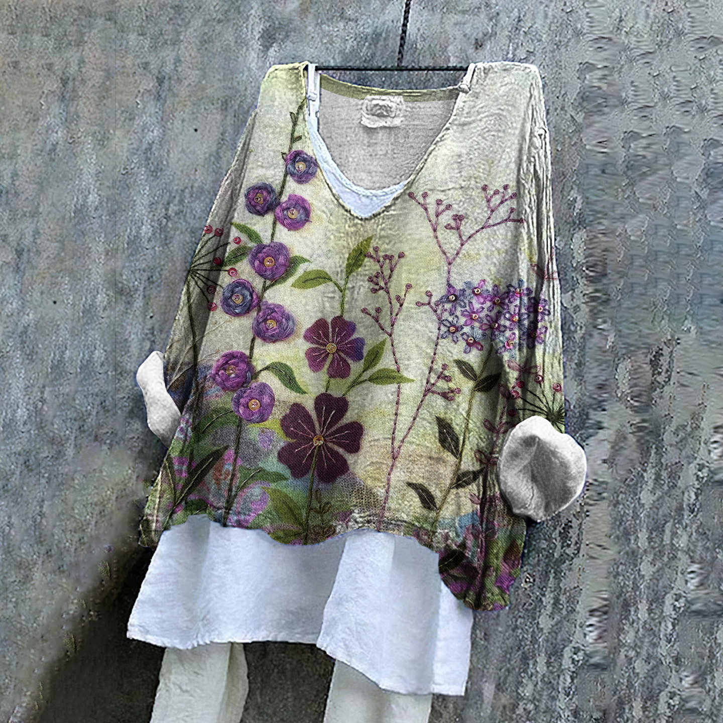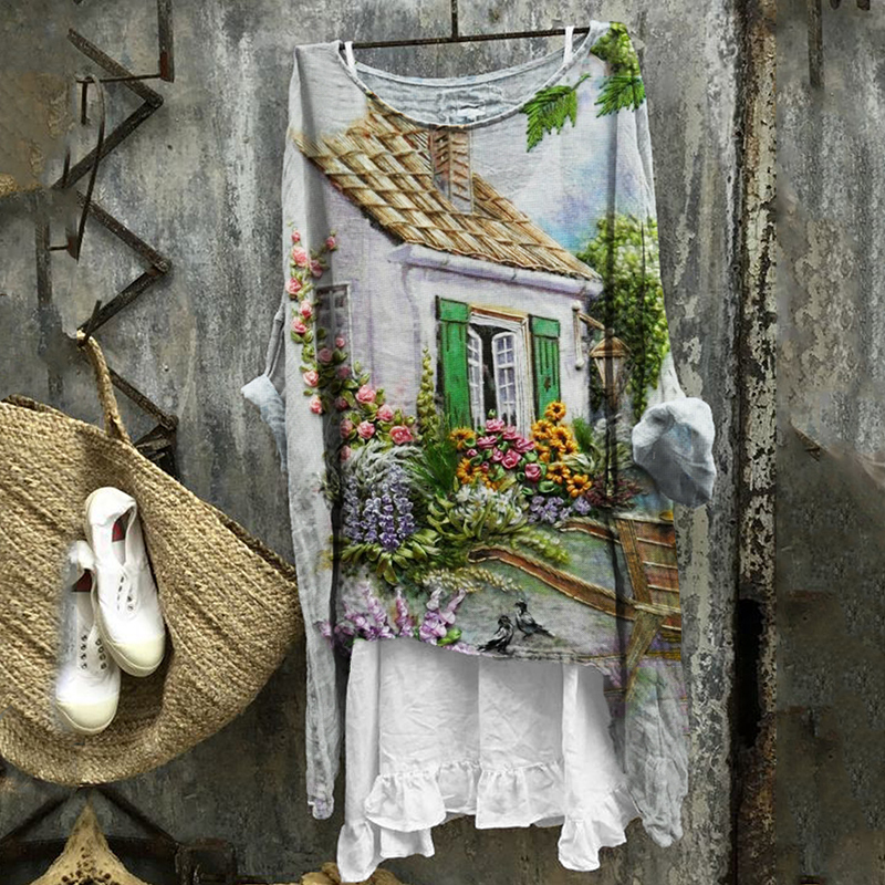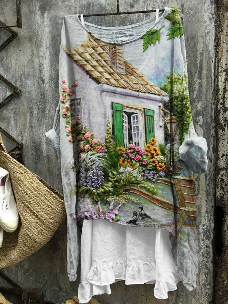 Cottage Floral Landscape Embroidered Fiber Art Linen Blend Tunic