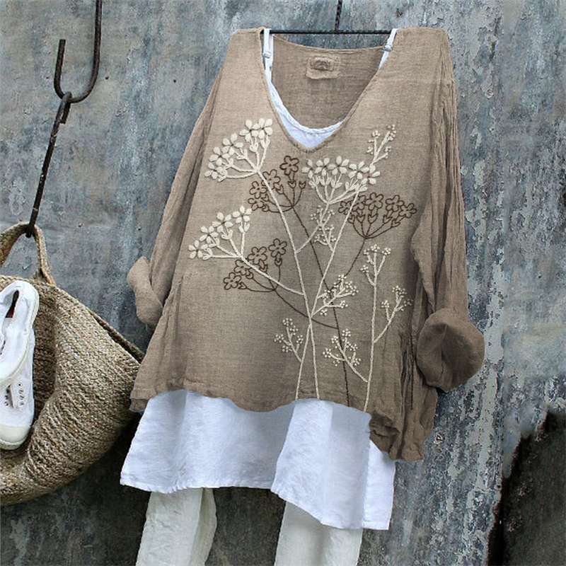 Women‘s Floral Art V Neck Linen Blend Shirt