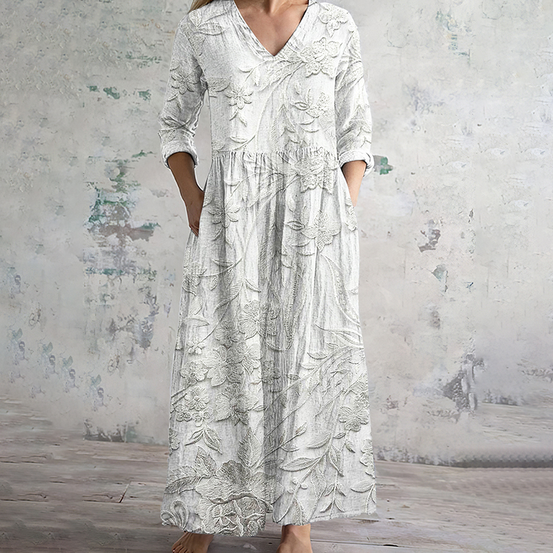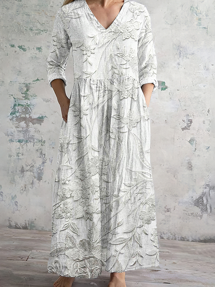 Japanese Embossed Floral Linen Blend Maxi Dress