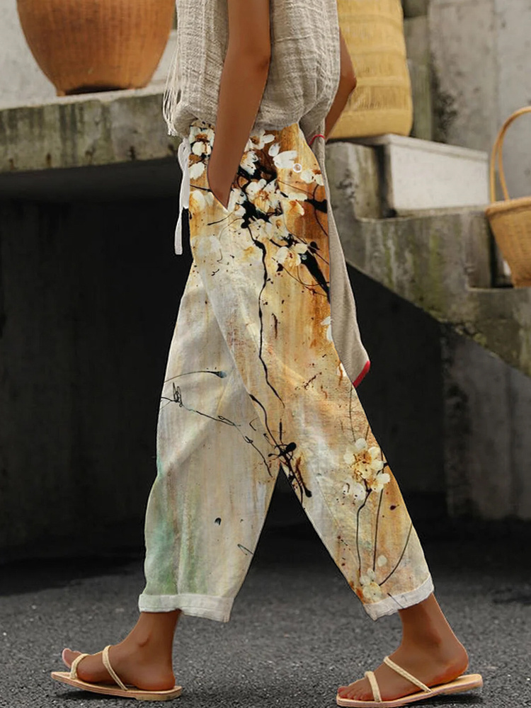 Vintage Ink Flower Print Casual Cotton Linen Pants