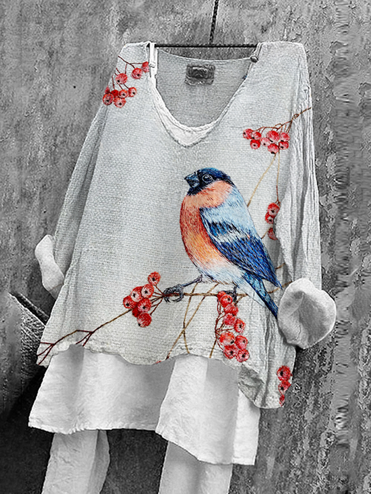 Vintage Birds And Floral Embroidery Art Linen Blend Blouse