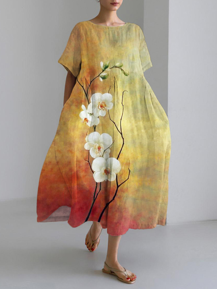 Gradient Orchid Japanese Art Linen Blend Maxi Dress