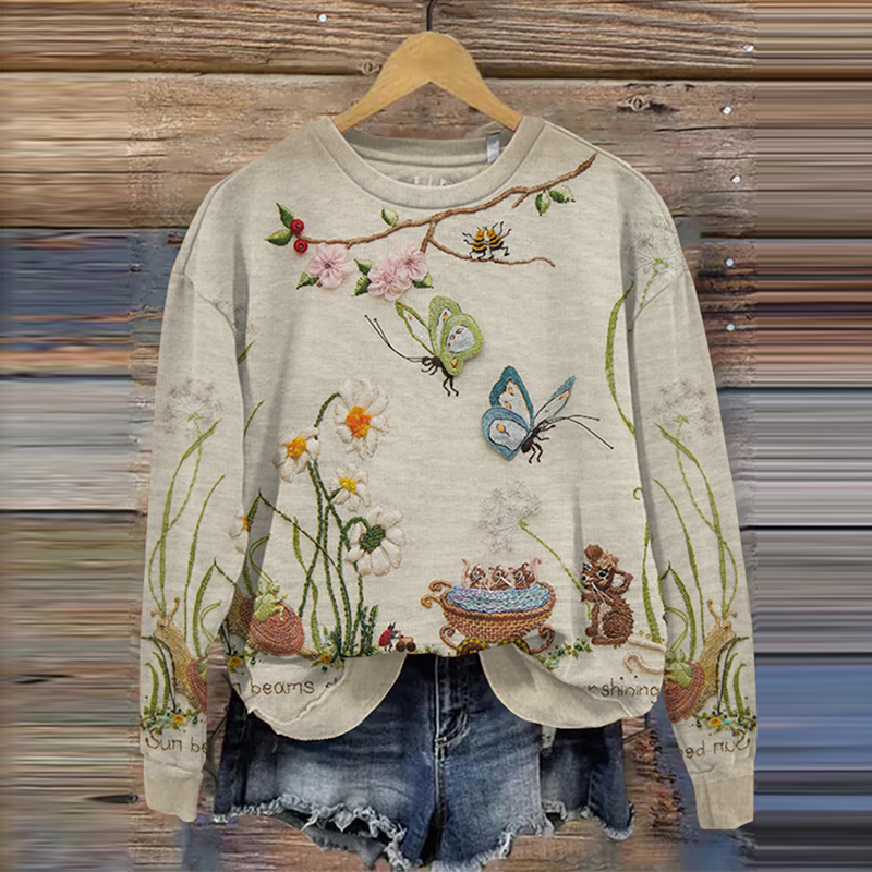 Floral And Butterfly Art Crew Neck Casual Long Sleeve Sweatshirt