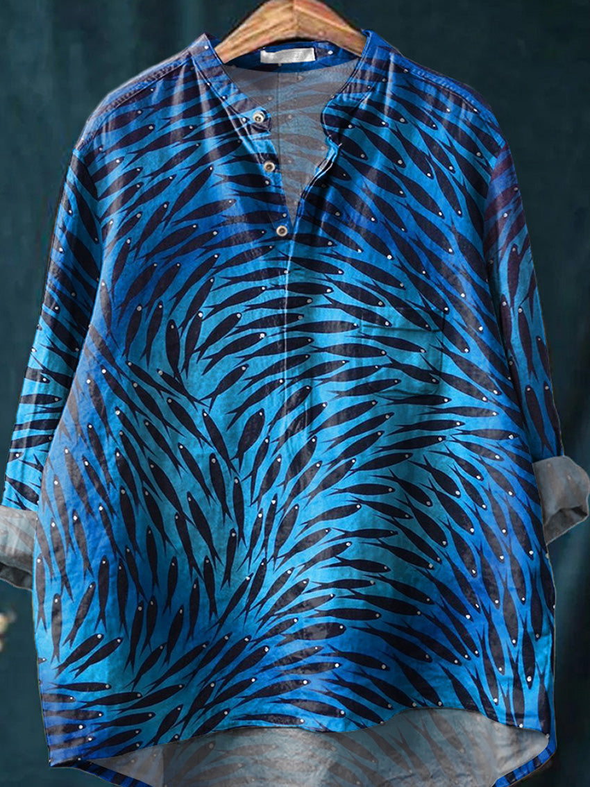 Colorful Abstract Fish Repeat Pattern Printed Women's Casual Cotton And Linen Shirt