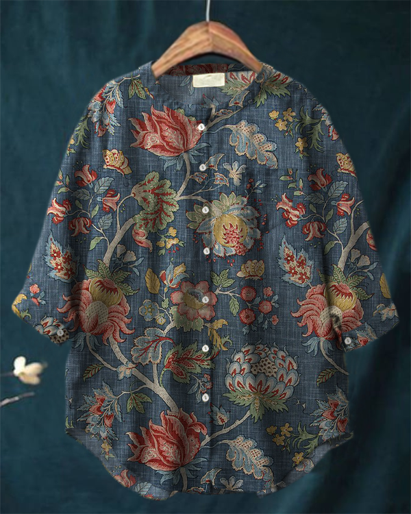Women's Vintage Floral Art Print Casual Cotton And Linen Shirt