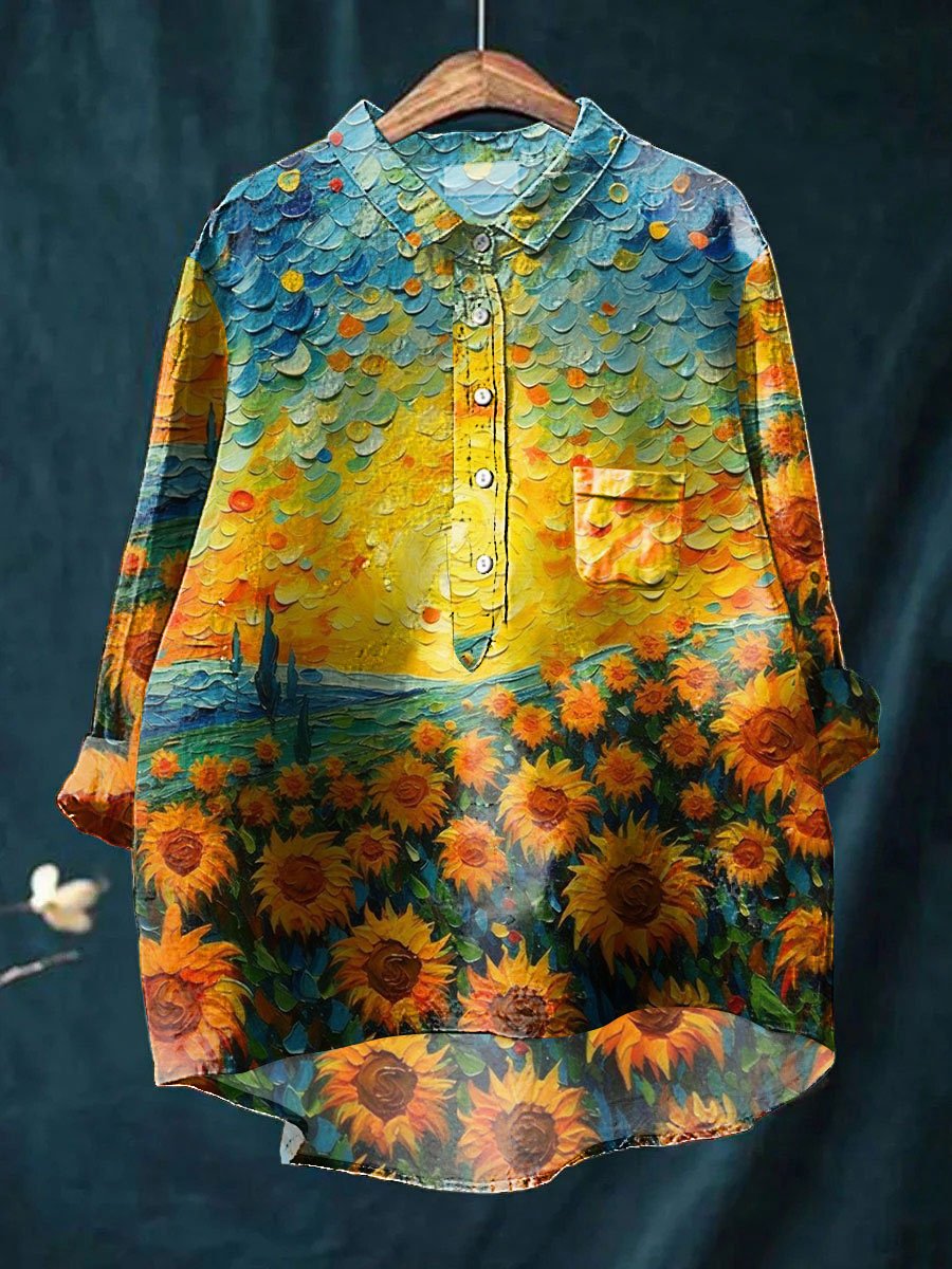 Women's Floral Art Print Casual Cotton And Linen Shirt