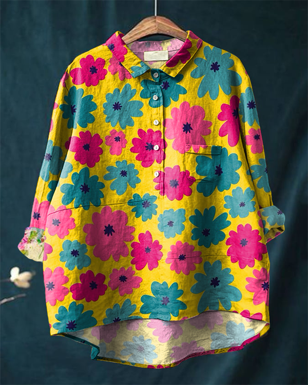 Women's Vintage Flower Art Print Casual Cotton And Linen Shirt