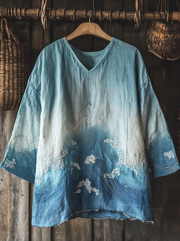 Vintage Waves Inspired Embroidery Japanese Art Linen Blend Cozy Tunic