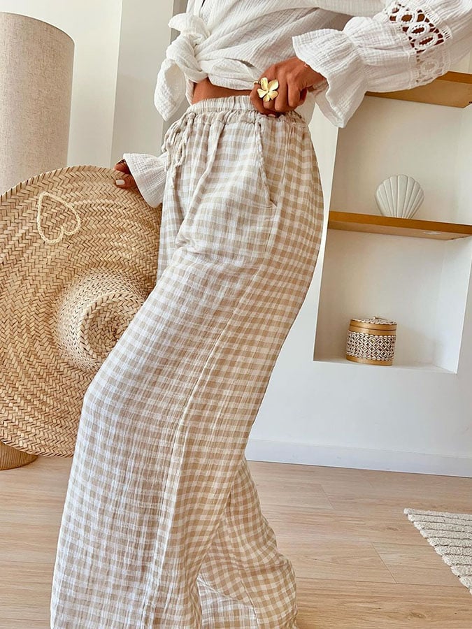 Women's Casual Plaid Cotton and Linen Wide Leg Pants