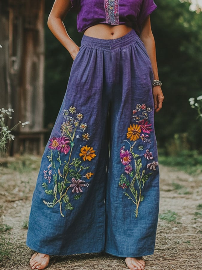 Women's Vintage Floral Holiday Art Printed Cotton And Linen Casual Pants