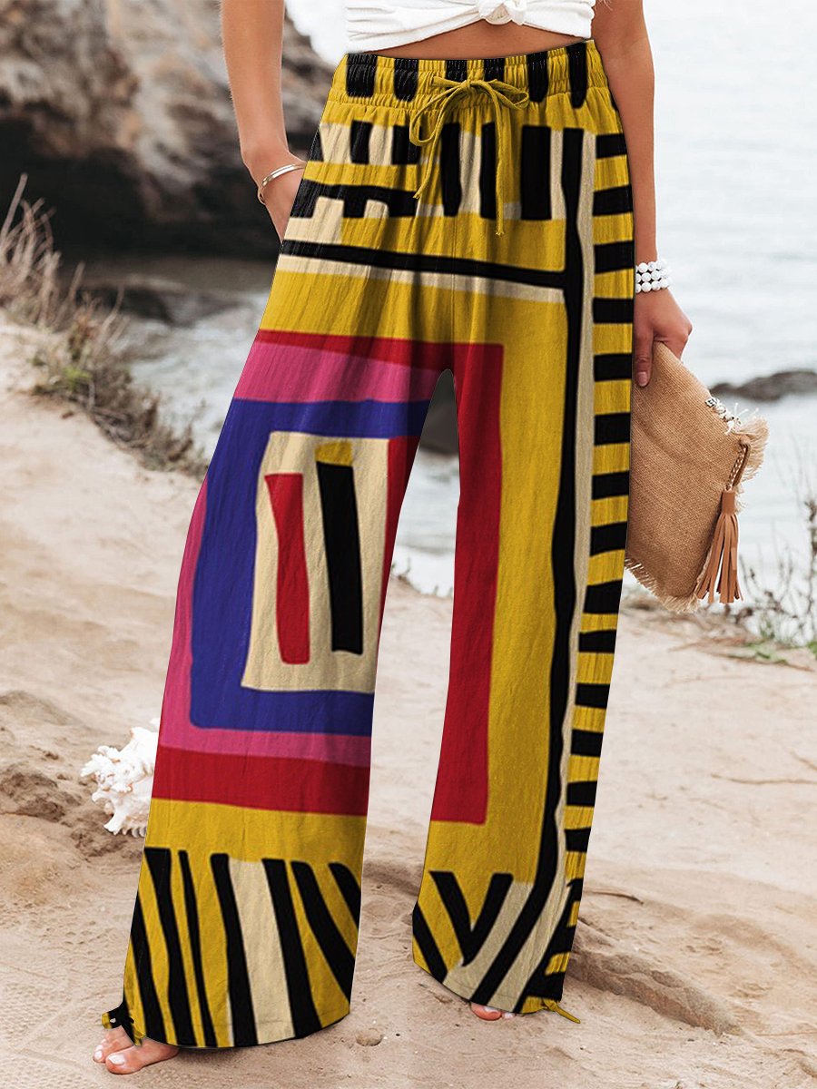 Women's Abstract Geometric Art Print Cotton And Linen Casual Pants