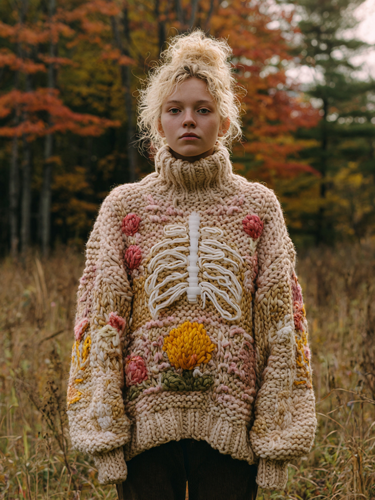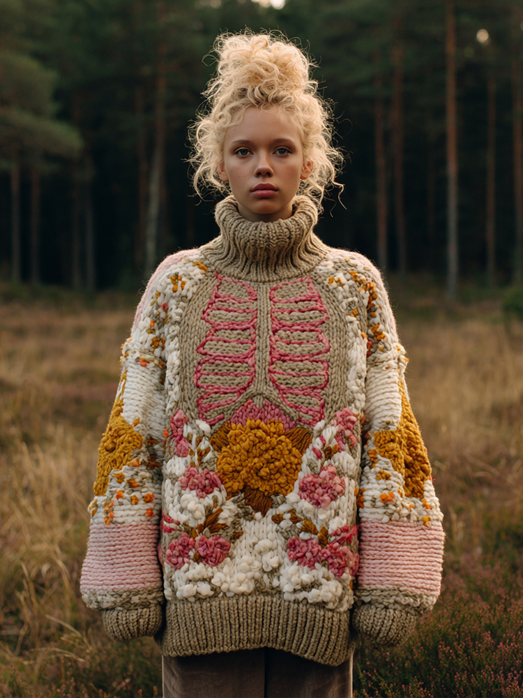Women's Human Organ And Floral Embroidery Art Cozy Knit Turtleneck Sweater