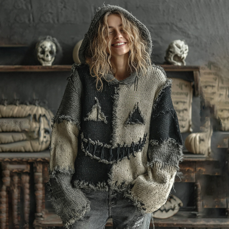 Halloween Spooky Face Contrast Stitched Hooded Cozy Knit Sweater