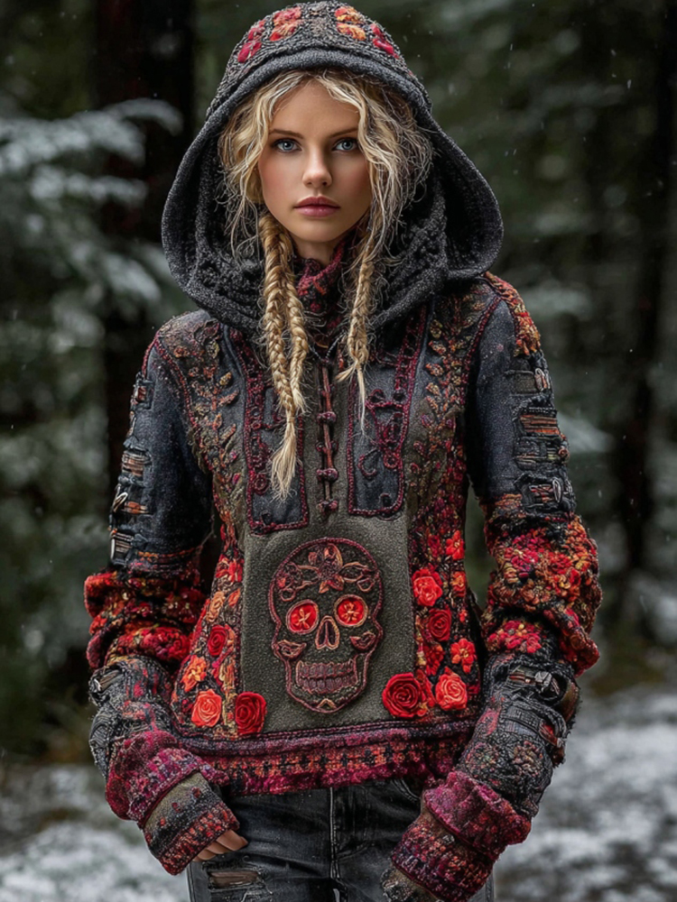 Women's Vintage Viking Skull And Rose Gradient Art Knit Hooded Sweater