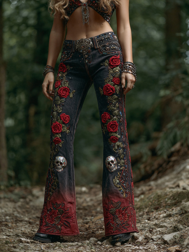 Rose And Skull Embroidered Patchwork Gothic Rock Jeans