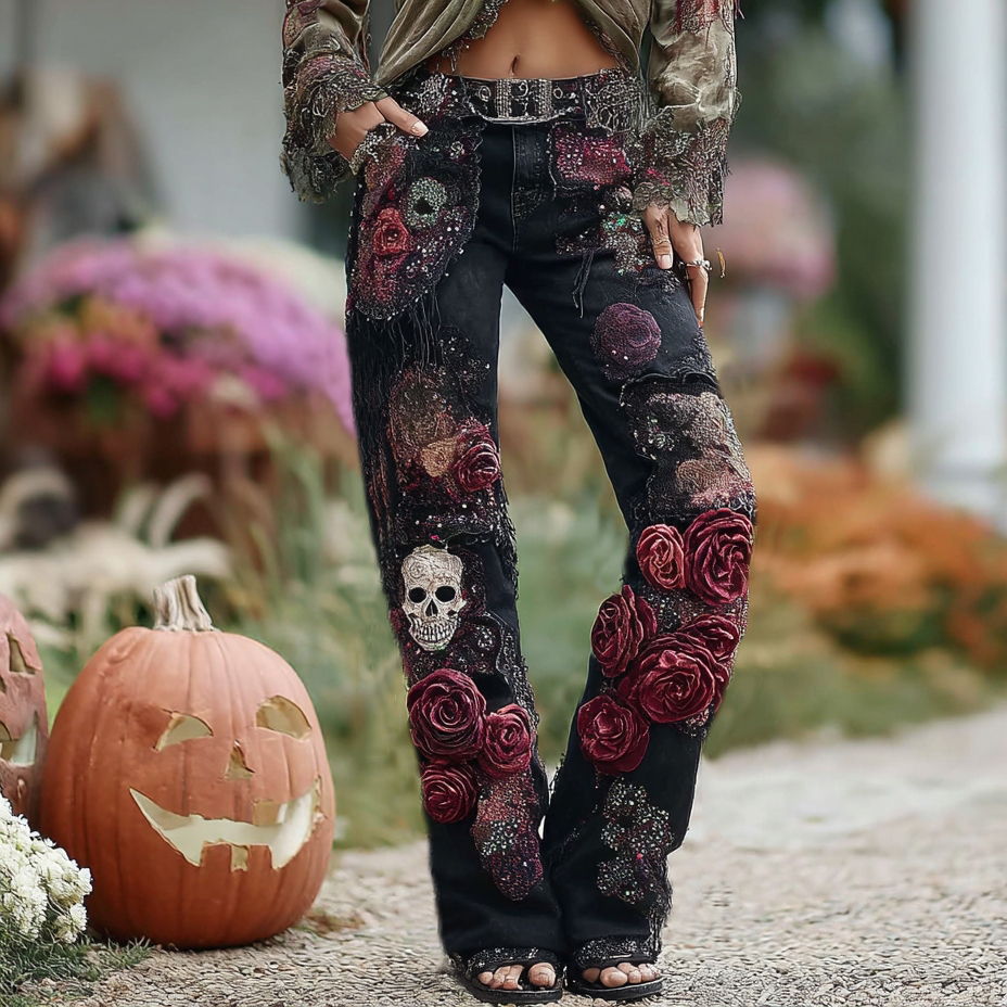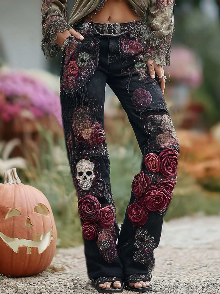 Rose Skull Embroidered Halloween Gothic Rock Jeans