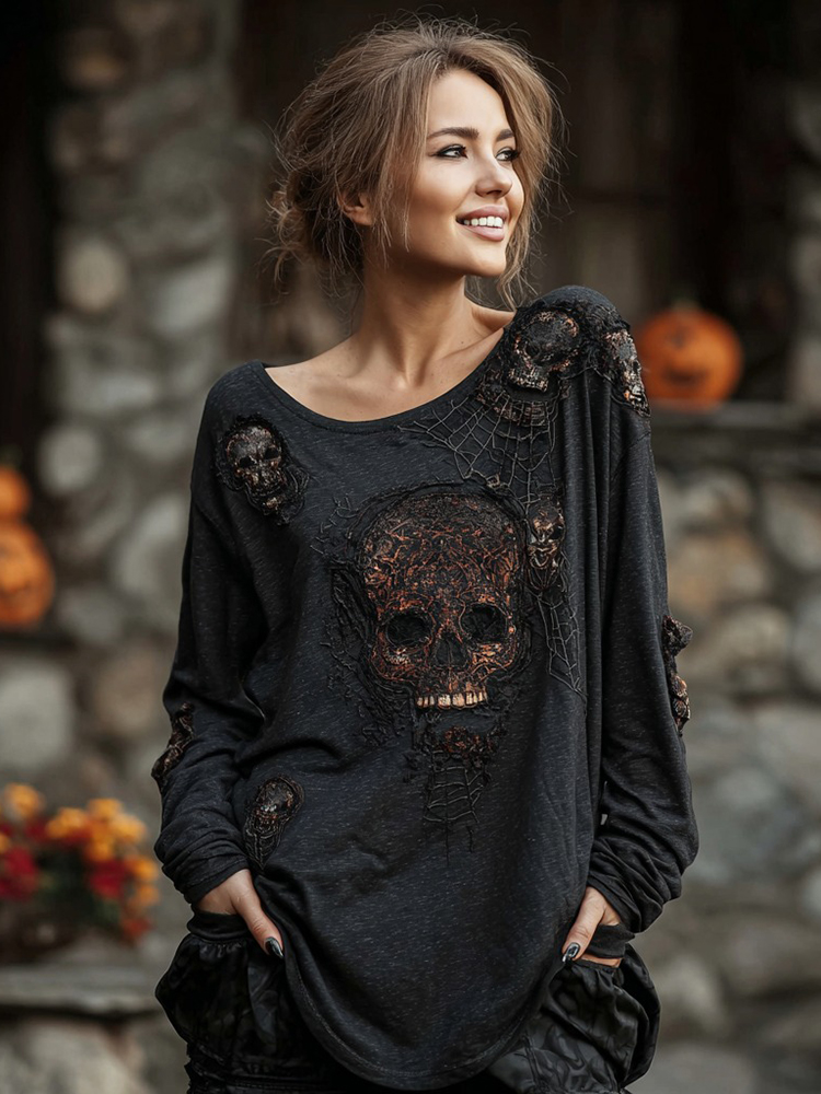 Women's Halloween Skull Embroidered Hooded Long-sleeved T-shirt