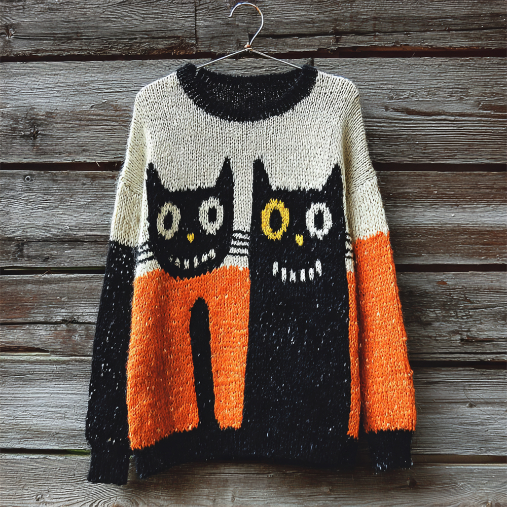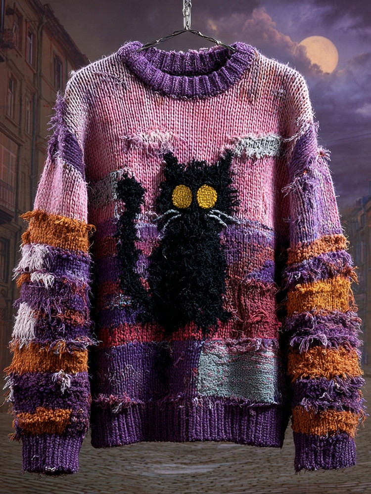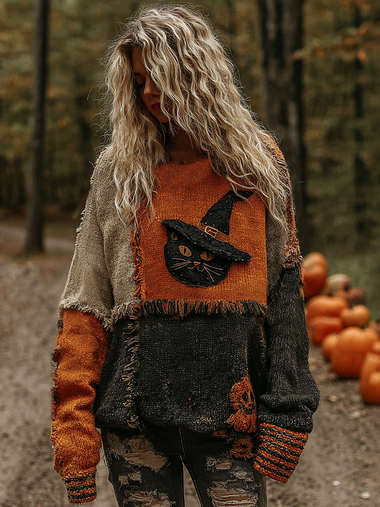 Halloween Black Cat Embroidered Patchwork Cozy Knitted Sweater