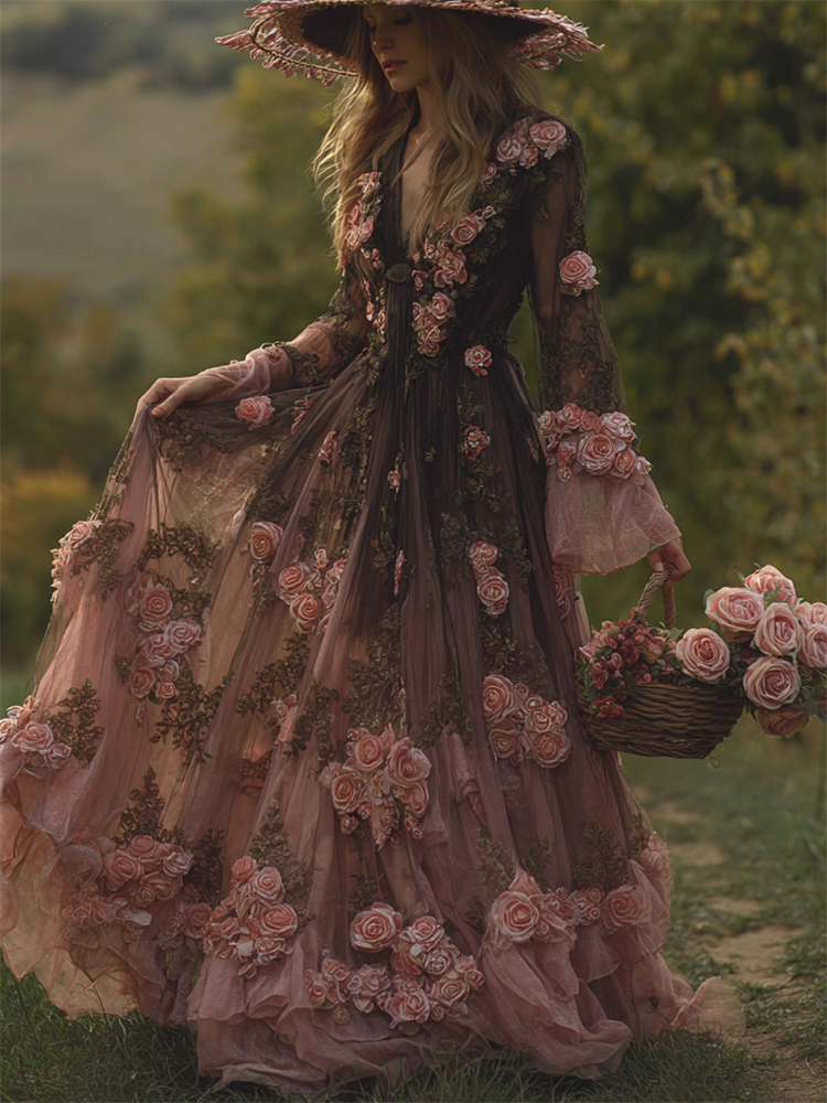 Vintage Pink Roses Gradient Flowy Maxi Dress