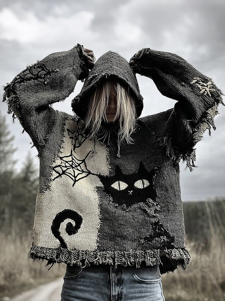 Halloween Scared Black Cat Patchwork Stitched Cozy Knit Hooded