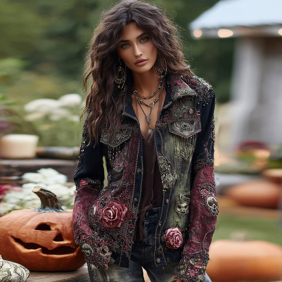 Rose Skull Embroidered Halloween Gothic Gradient Denim Jacket