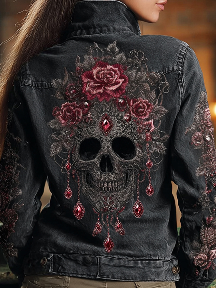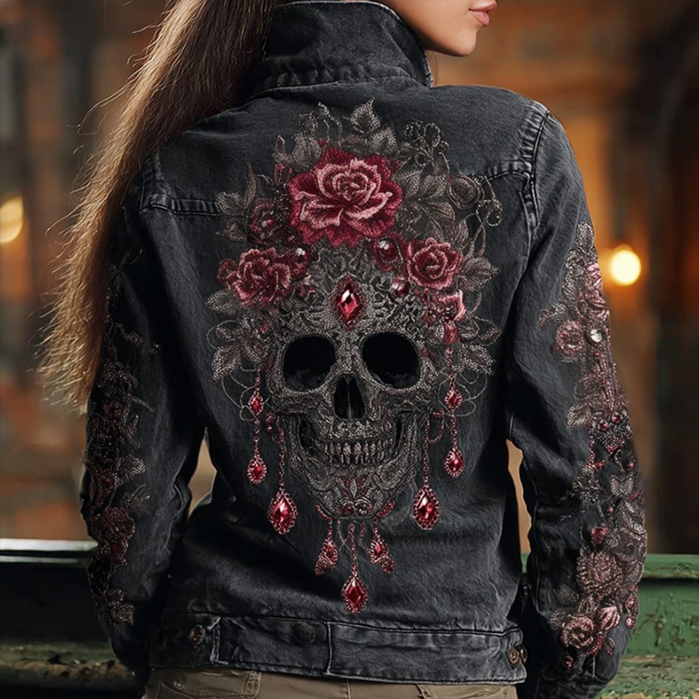 Women's Skeleton Rose Washed Long-sleeved Denim Jacket