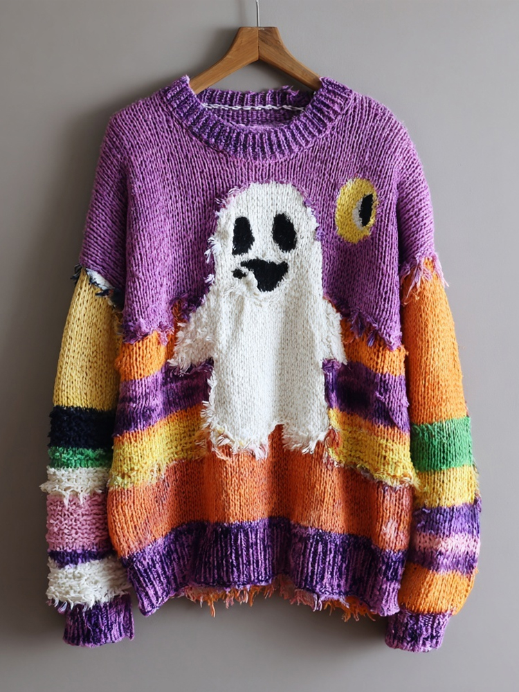 Halloween Spooky Ghost Embroidered Patchwork Cozy Knitted Sweater