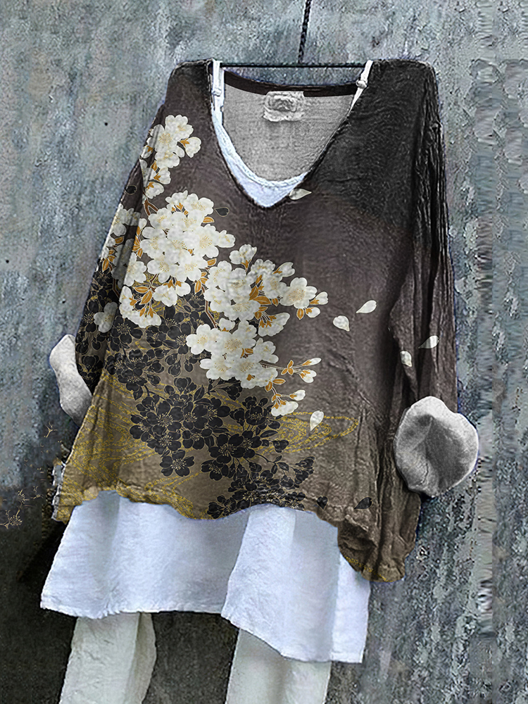 Vintage Artistic Flowers Cotton Linen V Neck Casual Shirt