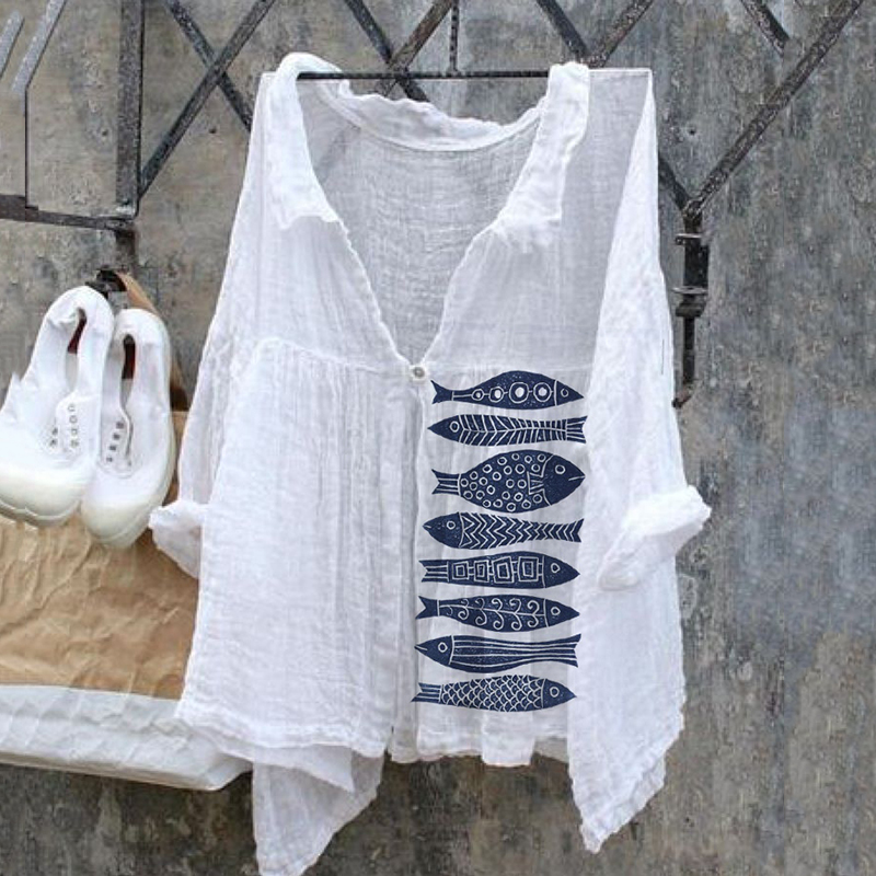 Vintage Japanese Art Fish Linen V Neck Button Comfy Shirt