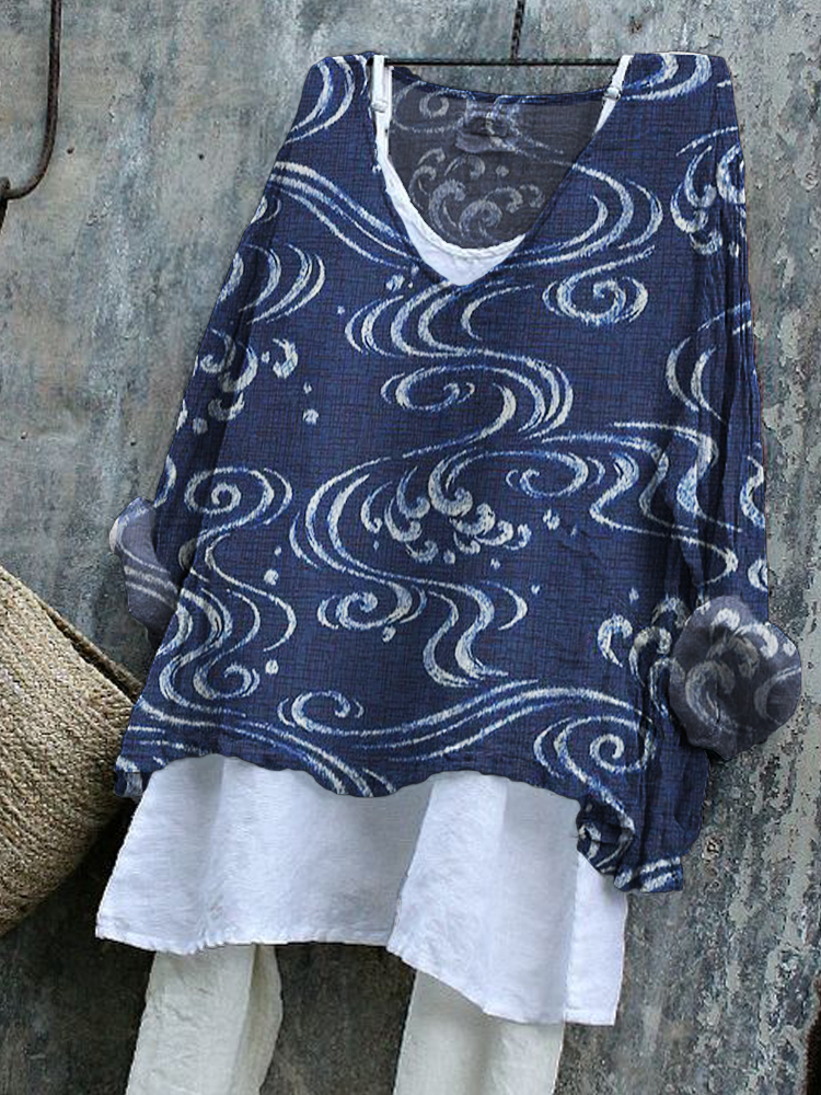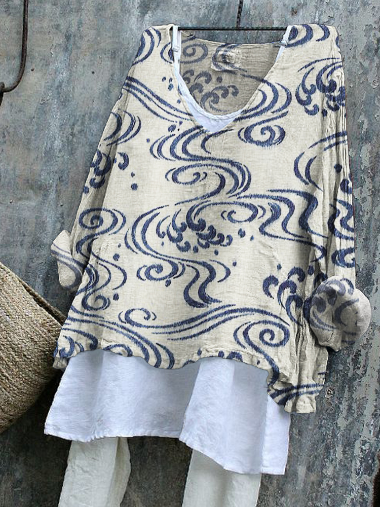 Japanese Art Print V-Neck Loose Blouse