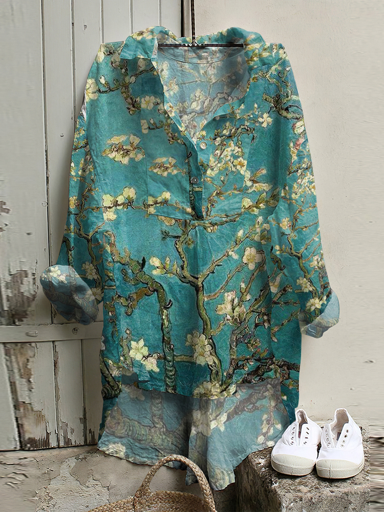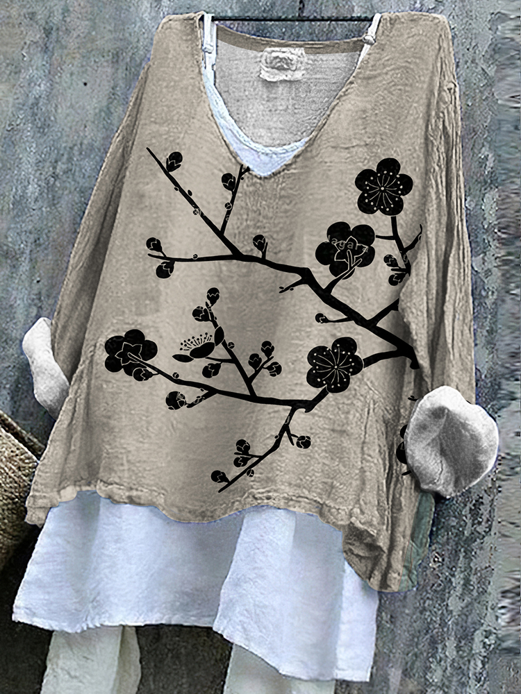 Vintage Japanese Art Floral Cotton Linen V Neck Casual Shirt