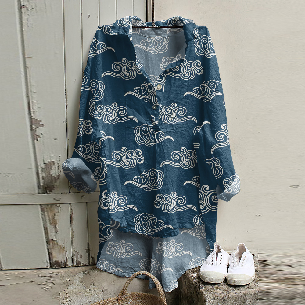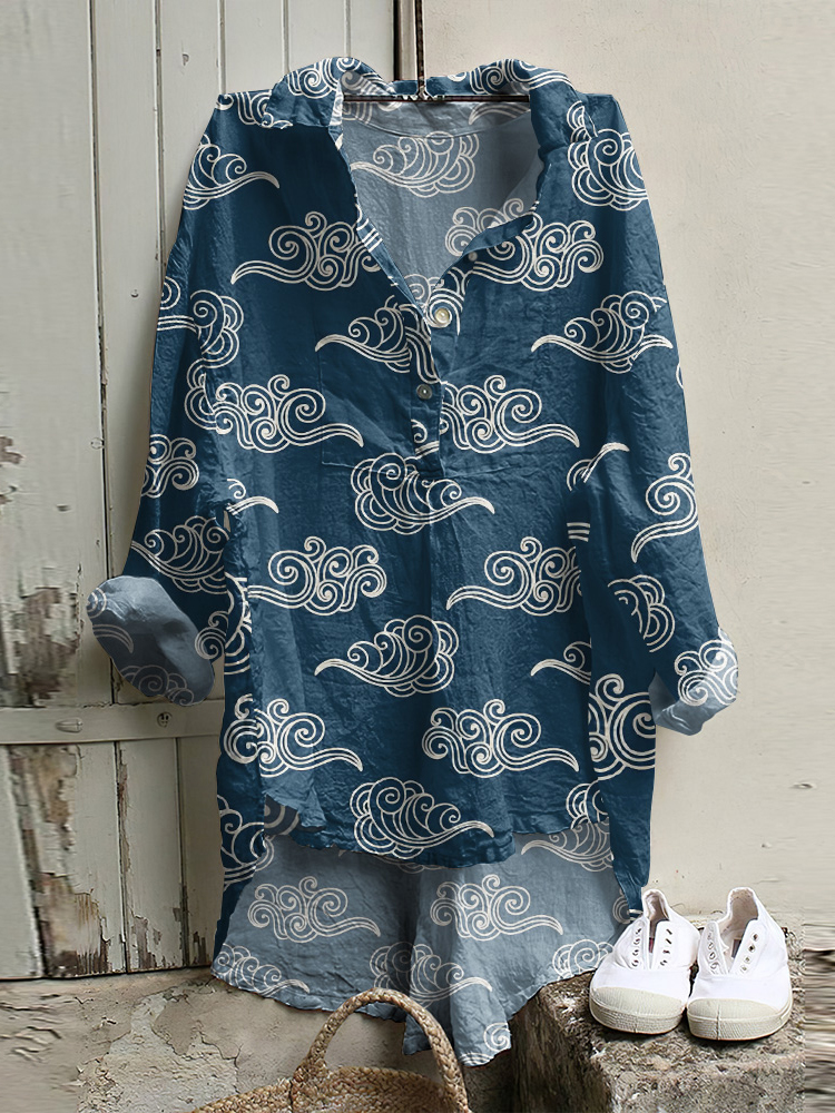 Japanese Art Cloud Print Long Sleeve Casual Shirt