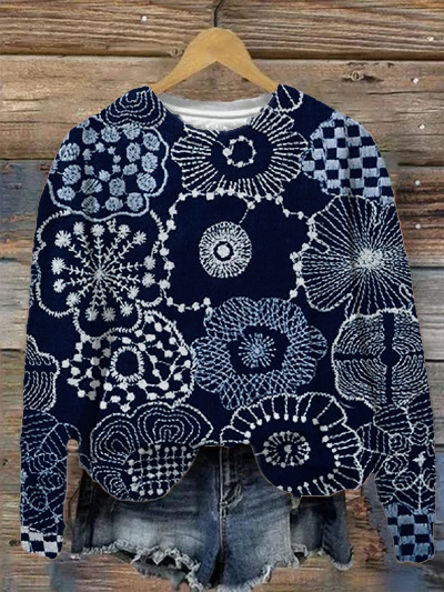 Women's Japanese Art Painting Embroidery Feeling Blue And White Sweatshirt