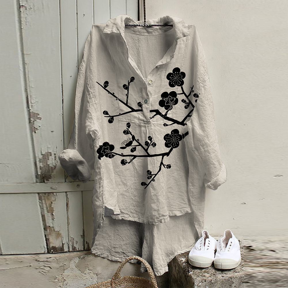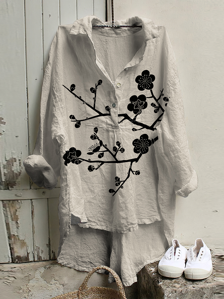 Vintage Japanese Art Sakura Cotton Linen Button Casual Shirt